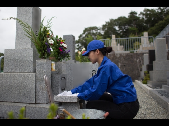 使用者様の代わりに墓石の拭き掃除や墓地内の雑草や植栽の剪定を行うサービスです。遠方の方やご命日やご法事がある方にご利用いただいております。